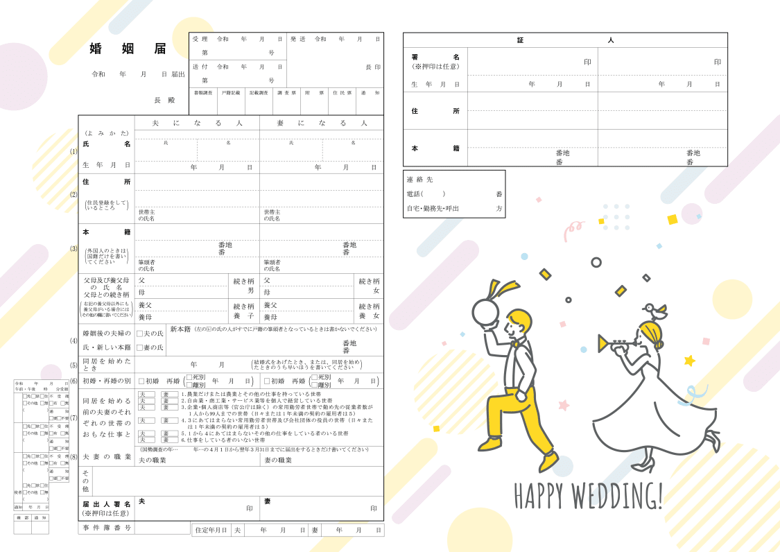 結婚の喜び溢れるイメージを、明るくポップなイラストと模様で表現しました。