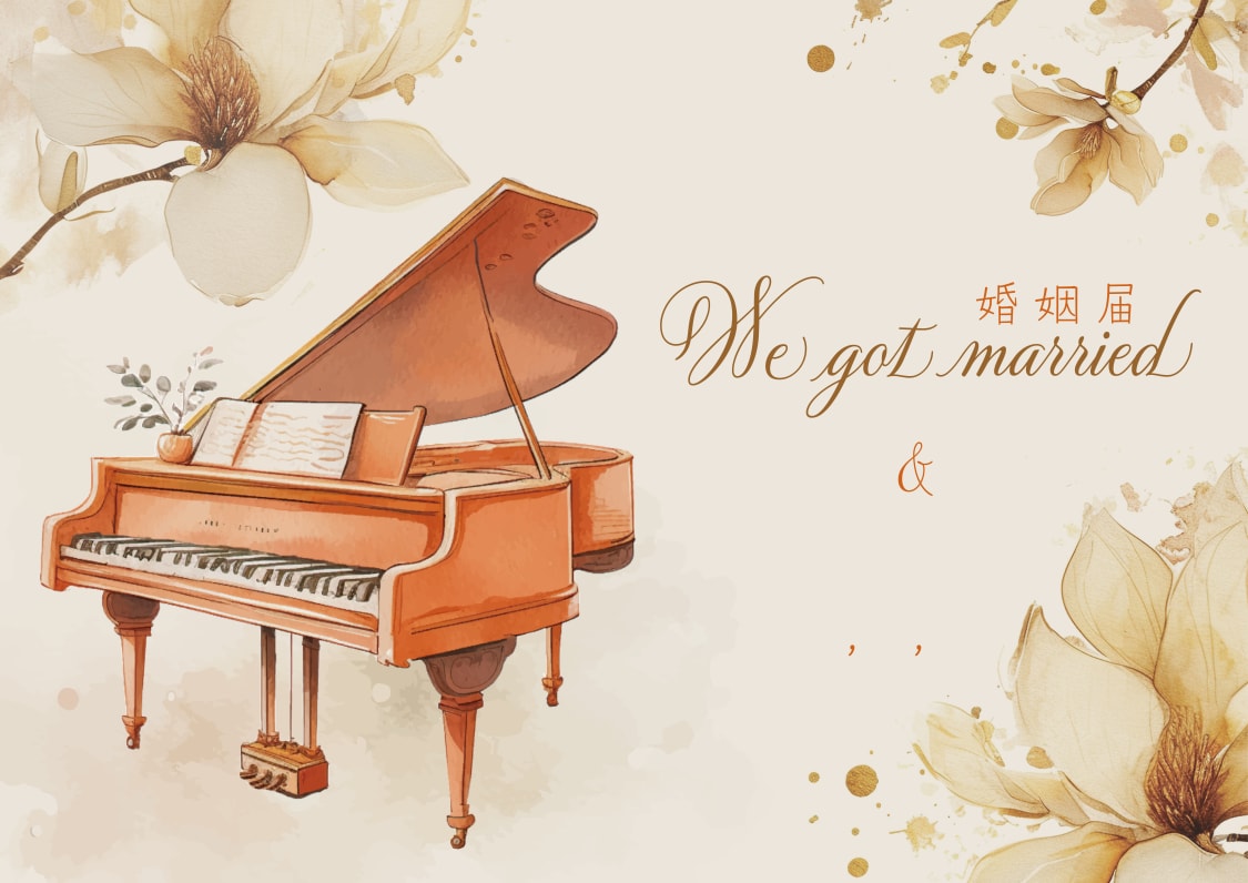クラシカルなピアノと、上品に咲き誇る花をあしらった婚姻届です。
