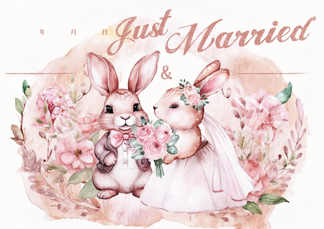 幸せな新しい始まり。全体的に水彩風のピンクの色合いが、愛や幸福感を表現します。うさぎ夫婦が結婚式を挙げる様子は、互いに向かい合う愛の象徴であり、特別な瞬間を祝福するデザインです。