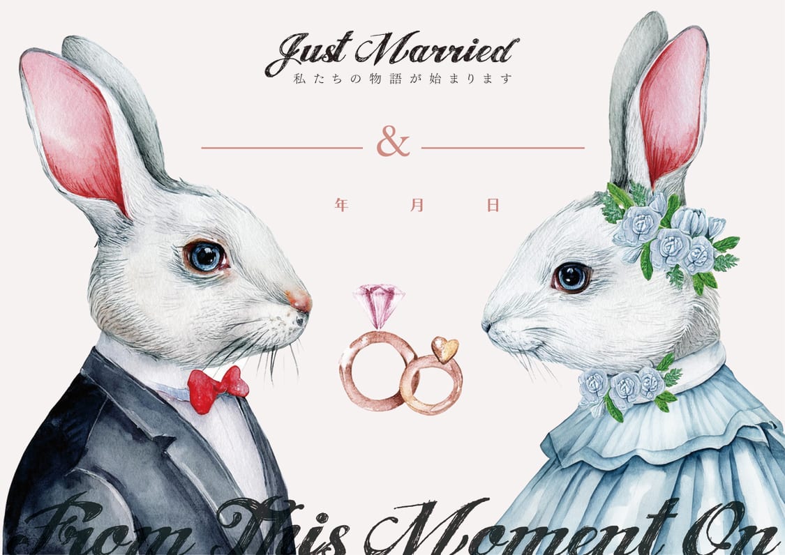 - 絵本のような可愛らしいデザインが、二人の愛の物語を優しく語ります。白いうさぎ夫婦は純真で無垢な愛を象徴し、水色の花飾りが新婦の美しさを引き立てます。中間のダイヤモンドとハート型の指輪は、愛の象徴として美しく表現します。