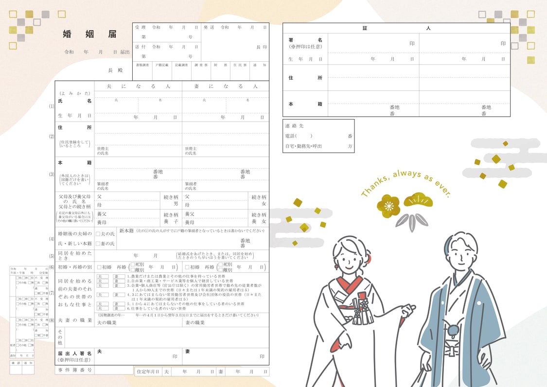 3. 本サービスデータをご利用者様ご自身がする婚姻届の届け出の目的以外で、二次利用することを目的としてダウンロードまたは保存等する場合は、事前に当社の許諾を得てください。なお、第三者の著作物や商標等が含まれている場合、または当社が適切でないと判断する場合は、その利用をお断りする場合があります。