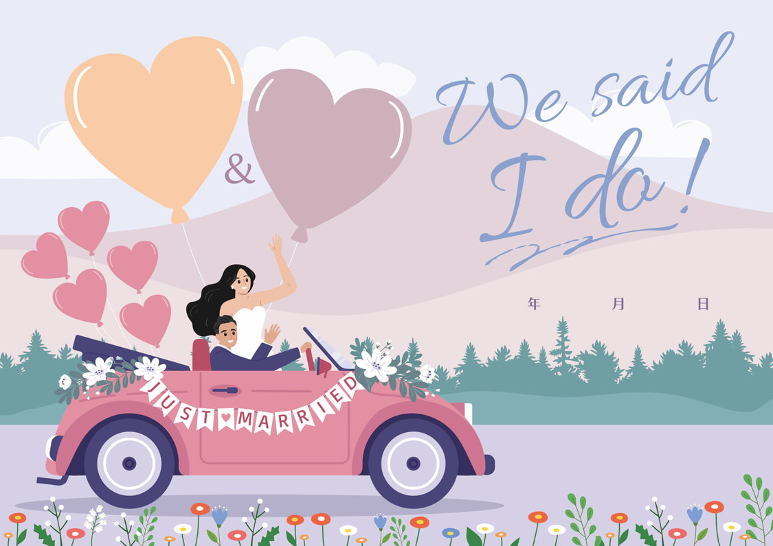 車に乗った新郎新婦が、共に進む未来への道を象徴します。ハート形の風船が幸福感を強調し、自然の背景が美しい旅を表現します。