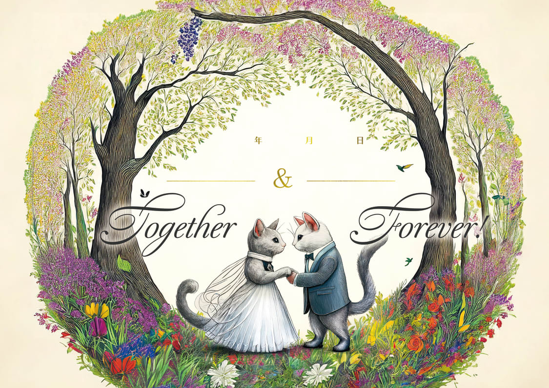 森の静けさと豊かな自然は、猫夫婦の愛がどのように育まれ、特別な瞬間を迎えたかを象徴します。大きな木々と花々が、木の間から差し込む光が神秘的な雰囲気を演出します、二人の愛を守り、支える存在として描かれます。