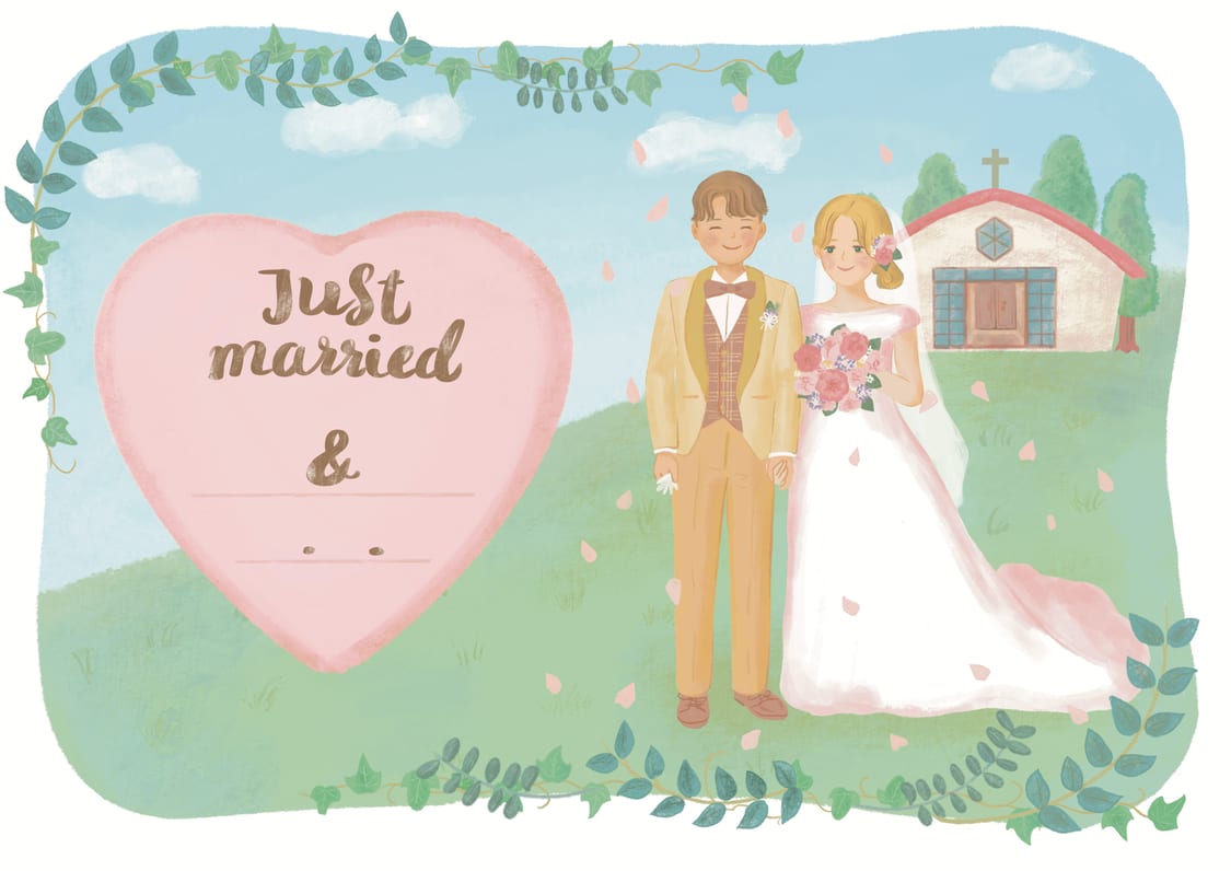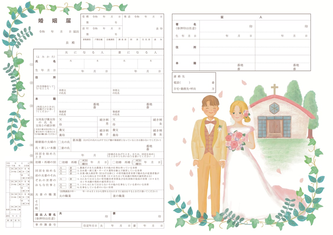 - 自然の植物に囲まれ、やさしくほほえみ合う新郎新婦の婚姻届です。いつまでも出会った頃の気持ちを忘れない仲良し夫婦をイメージしました。植物は、「幸せを呼ぶ木」と呼ばれ縁起の良いオリーブ、「誠実」「結婚」「永遠の愛」の花言葉をもつアイビーをあしらいました。ピンクのハートには記念日やお名前をお書きいただけます。(緑・ボタニカル・木・森・バラ・葉っぱ・お花・チャペル・丘・青空などお好きな方に)