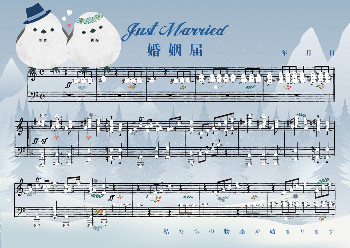- 真っ白なシマエナガたちが、結婚行進曲の音符となって舞い踊る。